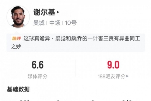 谢尔基本场数据:1进球被吹2抢断3地面对抗成功,评分6.6