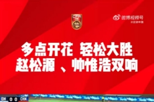 赵松源、帅惟浩双响,王贺毅、张伯霖、艾力卡木·伊力洪建功,中国U-17国家男子足球队7比0大胜印度尼西亚U-17国家男子足球队。