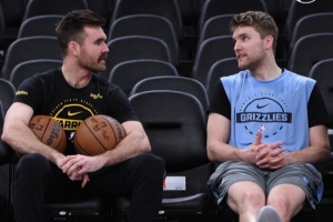 兄弟对决!勇士主场迎战灰熊 赛前帕特·斯潘塞和弟弟卡姆合影