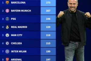 弗里克接手后各项赛事进球榜:巴萨273球 拜仁、巴黎、皇马列前四