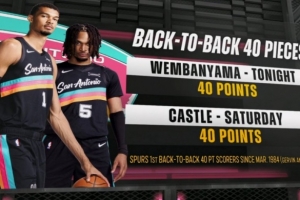卡斯尔+文班!马刺连续两场不同球员砍下40+ 队史40多年来首次