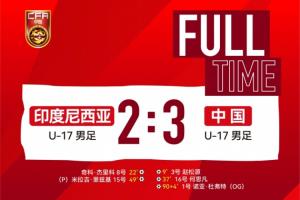 中国U-17国家男子足球队国际友谊赛,中国队3比2战胜印度尼西亚队,赵松源、何思凡先后建功,张伯霖造对方门将乌龙,绝杀比赛。
