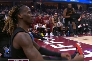 与队友同在!基翁·埃利斯上篮倒地 哈登从替补席冲上去拉前者