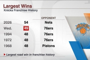 3次赢76人48+!狂胜49分为尼克斯队史第2多 是队史客场最大净胜分