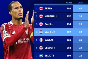 德转盘点英超历史中后卫进球排名:特里41球居首 范戴克27球第四