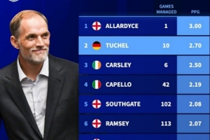 完成续约!英格兰队史主帅场均积分榜:图赫尔2.70分次席