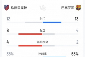 效率制胜!马竞4-0巴萨数据:射门12-13,射正8-4,得分机会4-2