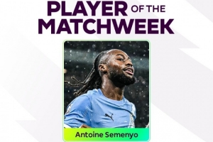 传射建功,官方:曼城边锋塞梅尼奥当选英超第26轮最佳球员