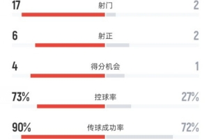 阿森纳4-0维冈竞技全场数据:射门17-2,射正6-2,控球率73%-27%