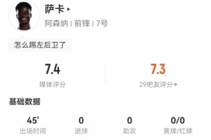 萨卡半场被换下:2射0正+3造犯规 7对抗6成功 获评7.4分