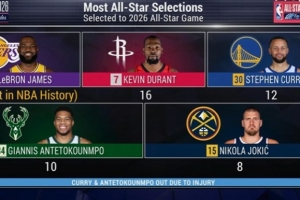2026年全明星球员入选次数排行榜:詹姆斯22次历史最多