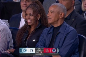 看看是谁来了!奥巴马现身洛杉矶观看全明星 赛前与布克拥抱致意