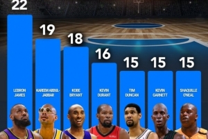 全明星次数排行榜:詹姆斯22次一骑绝尘 科比18次第三 KD16次第四