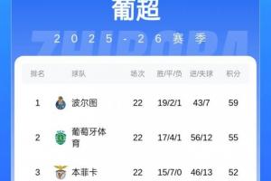 体育资讯02月16日讯 葡超第22轮,争冠三大豪门均1球小胜。目前波尔图仍4分领跑,葡体排第2,穆里尼奥率领的本菲卡赛季仍不败,暂时落后榜首7分。
