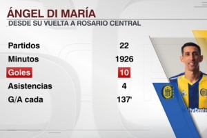 据ESPN统计,迪马利亚回顾罗萨里奥中央以来出战22场比赛,出场时间1926分钟,打进10球,助攻4次,平均每137分钟参与1球。