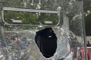 大巴司机回忆道:“就在那边,15米远的地方,我们从训练基地一路顺利开到了转盘。但在进入大门前,他们向我们投掷石块、瓶子,还砸向了挡风玻璃。”