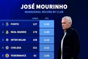穆里尼奥执教不同球队场均积分:波尔图2.32分最高,皇马2.3分