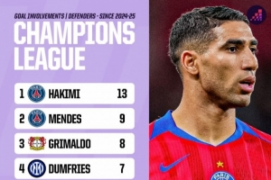 上赛季以来后卫欧冠参与进球:阿什拉夫13球最多,门德斯9球次席