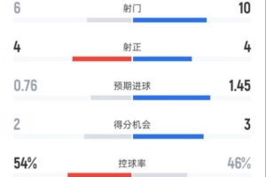 米兰1-1科莫全场数据:射门6-10,射正4-4,控球率54%-46%