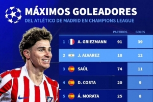 马竞队史欧冠射手榜:格列兹曼39球居首,阿尔瓦雷斯12球次席
