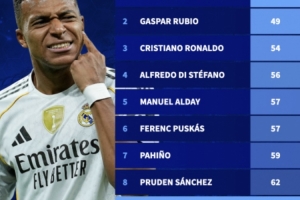 皇马队史50球场次排行榜:姆巴佩第9,C罗第3迪斯蒂法诺第4