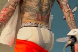 放飞自我!三球赛后光膀子接受采访 中途离席露出打底裤