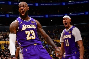 指哪儿打哪儿!詹姆斯三分线外灵犀一指 海斯起飞空接炸筐重扣