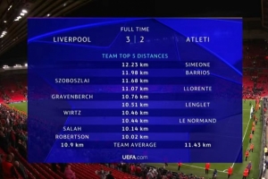 利物浦vs马竞跑动距离:小西蒙尼12.23km最多,红军队内索博居首