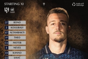 吉达联合首发:1-拉伊科维奇、2-达尼洛·佩雷拉、15-哈桑·卡迪什、20-沙拉希利、13-基尚提、8-法比尼奥、17-杜比亚、10-奥亚尔、12-米塔伊、19-迪亚比、21-恩内斯里
