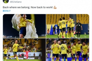 此役过后,利雅得胜利登顶沙特联赛积分榜,C罗社媒晒出比赛照片,配文:“回到了我们该在的位置,现在回去继续努力!”