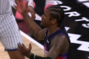 滑了一步!肯纳德面对阿门后退时踩到中线 被吹回场违例