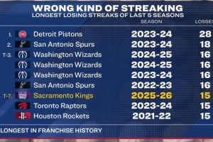近5季最长连败纪录榜:23-24赛季活塞断档领跑 今年国王进前十