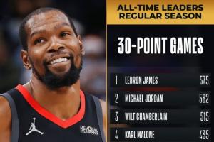 里程悲~杜兰特生涯30+场次超越贾巴尔独占历史第6 差1场追平科比