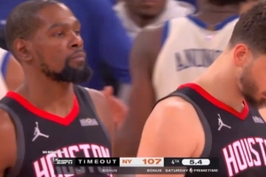 一声长叹~火箭最后5.4秒落后4分 杜兰特一脸无奈表情走向替补席