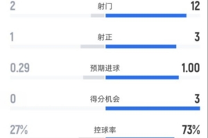 热刺半场1-1阿森纳数据:射门2-12,射正1-3,控球率27%-73%