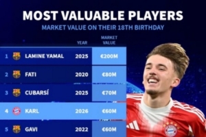 球员18岁生日当天德转身价榜:亚马尔2亿欧居首,卡尔6000万欧