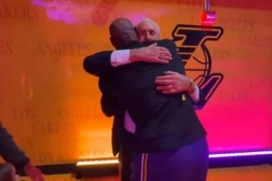 曾在热火共事四年!莱利雕像揭幕 詹姆斯赛前和他拥抱致意