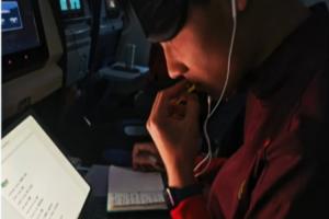 王磊:“这个队里面,我看大约能有80%的孩子都在用多邻国,他们这个手机都有这个软件、都在学。最明显是毛伟杰,从广州飞来的飞机上,我拍了一张照片,大家都在睡觉,他坐最后一排,我正上卫生间,我看他在那儿看ipad,我还想说,这么晚不睡,但我看他在那学英语,都在飞机上学英语。”