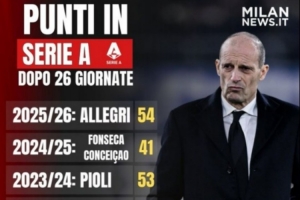 阿莱格里本赛季执教米兰前26轮意甲54分,比上赛季同期高13分