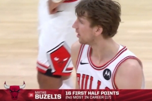 得分靠你!布泽利斯半场12中7砍16分4板 上半场得分生涯第2高