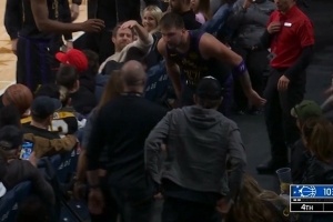 展示赢球决心!东契奇飞身救球直接飞到观众席第三排