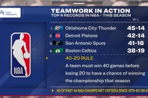 40-20夺冠定律:近44冠40队符合 本季雷霆活塞马刺达标 绿军有戏