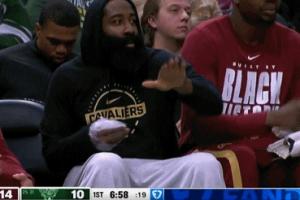 右手拇指非移位性骨折!哈登场边观战 右手拇指已缠上厚厚的纱布