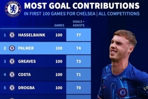 切尔西球员百场造进球数据:帕尔默74球队史第二