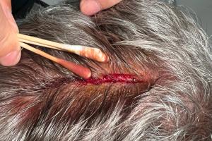 国安翻译赛后晒出塞蒂恩伤口,他的头顶被划出一道大口子。
