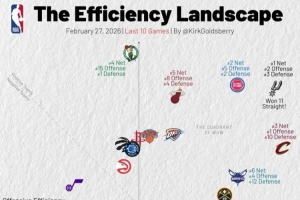 近10战攻防:骑士进攻第1 马刺攻2防3&净效率1 湖人&勇士攻守皆弱