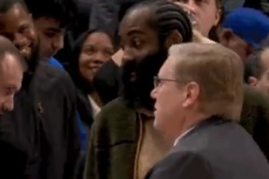 轻松惬意!活塞主场音响设备出问题 哈登场边热聊