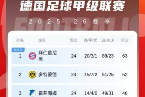 夺冠更稳了!德甲积分榜:拜仁扩大优势11分领跑,多特2轮不胜第2