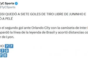 其中在TYC体育的报道中,梅西与贝利并列70球,距离第一的儒尼尼奥7球。