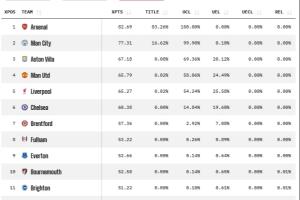 英超最新夺冠概率:阿森纳83.26% 曼城16.62% 曼联+利物浦均0.02%